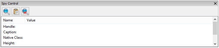 TraceIt Window consists of three icons - spy open, spy close and Generate code. The spy open is used to spy the properties of any win32 control such as Handle, caption, native class, height and width. The properties are generated as code in the code editor window by clicking the Generate code button. The control can be closed by clikcing spy close